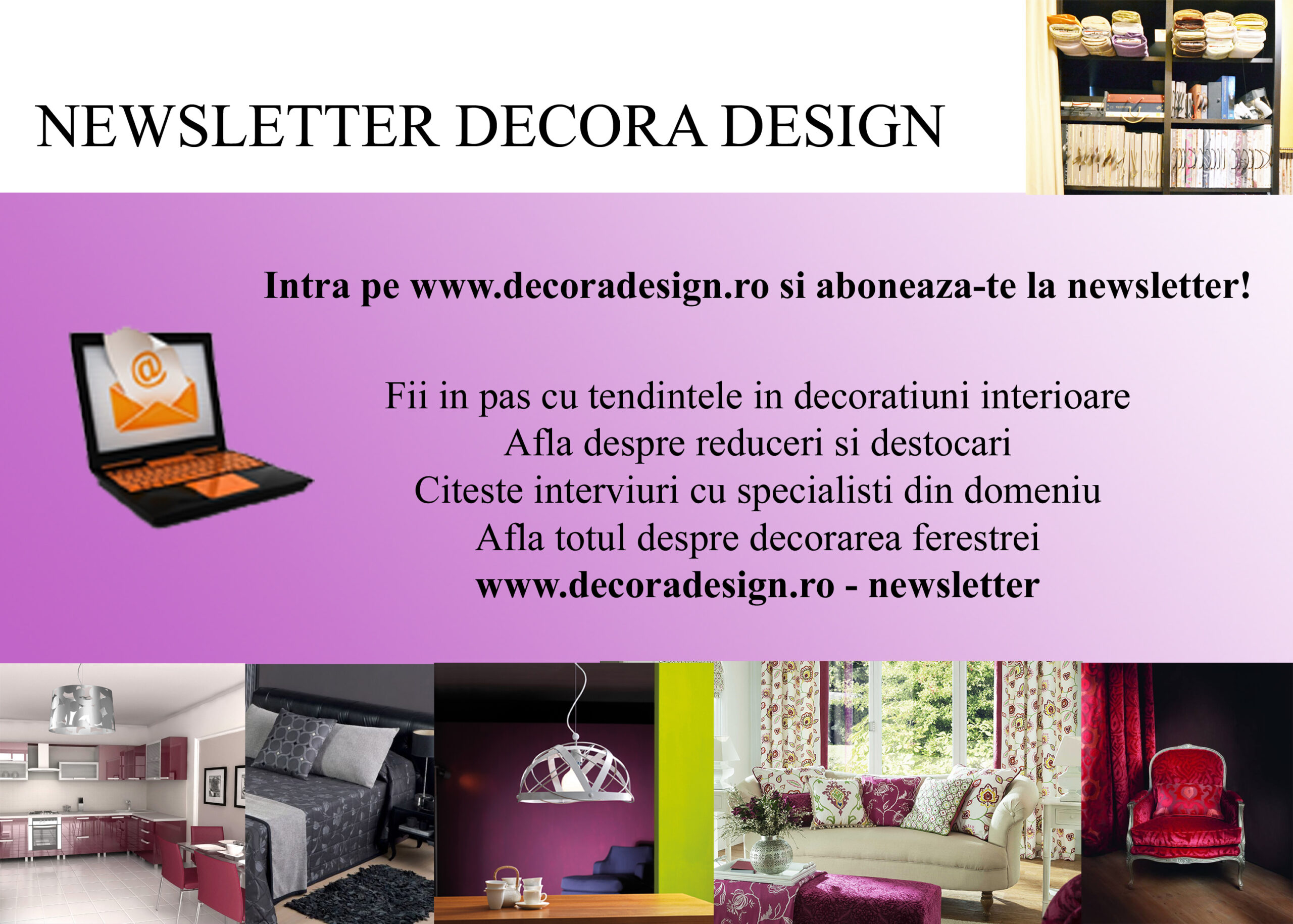 Va pregatim informatii noi, reduceri si surprize. Daca vrei sa fii primul care afla de noutatile Decora Design, aboneaza-te la newsletter-ul nostru: www.decoradesign.ro.