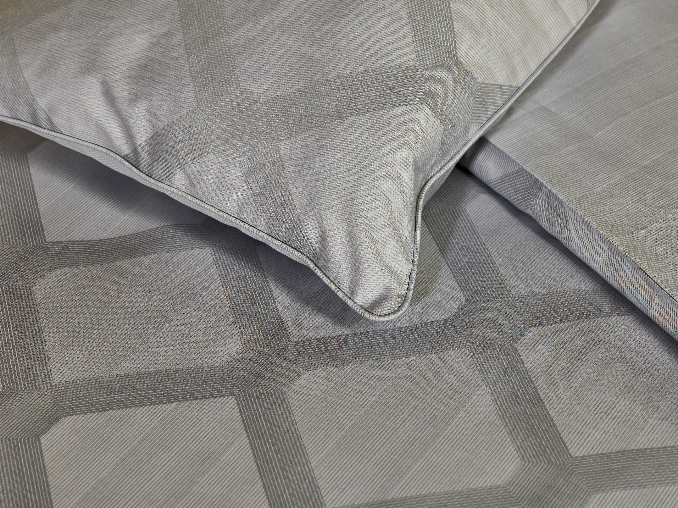 Bumbac jacquard cu model reliefat, durabilitate ridicată și rezistență la șifonare. Textura sa elegantă și sofisticată adaugă profunzime și rafinament oricărui dormitor.