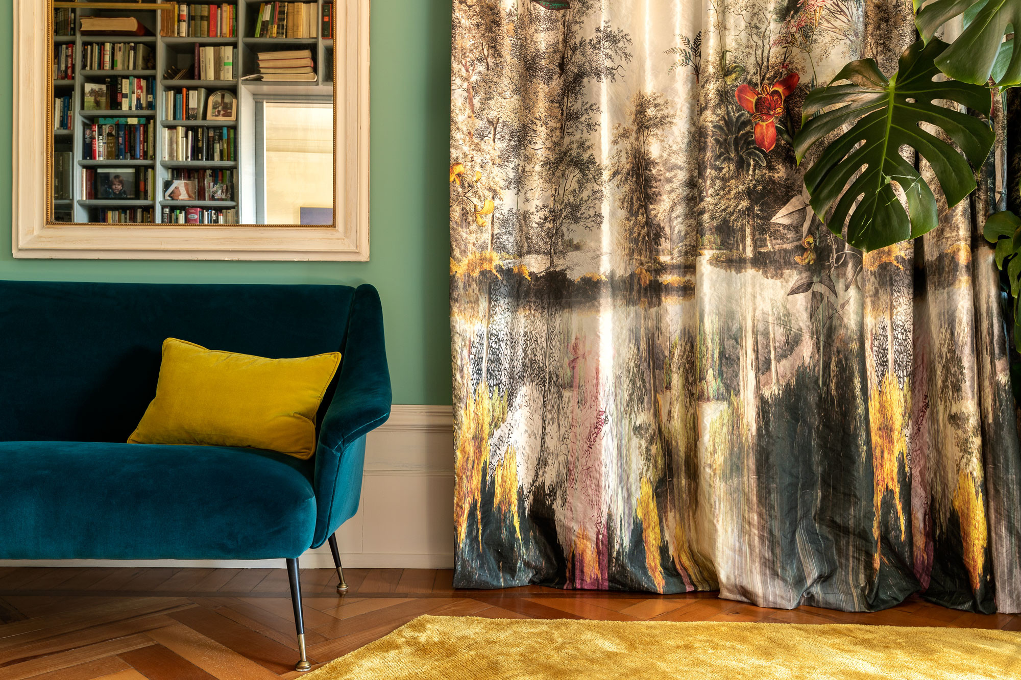 Draperie fonoabsorbantă bej printat model natură pentru salon și izolare fonică – Decora Design București