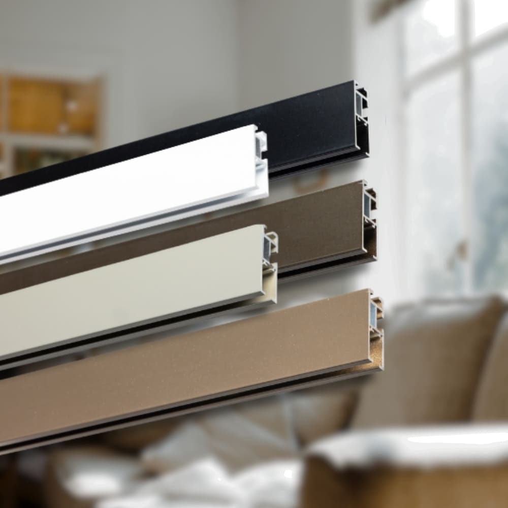 Vă oferim șine la comandă, în diverse dimensiuni, adaptate tipului de produs ales: perdele, draperii, panouri japoneze sau jaluzele verticale. Acestea sunt fabricate din aluminiu și disponibile în alb, gri sau negru vopsite în câmp electrostatic pentru un finisaj durabil și elegant.